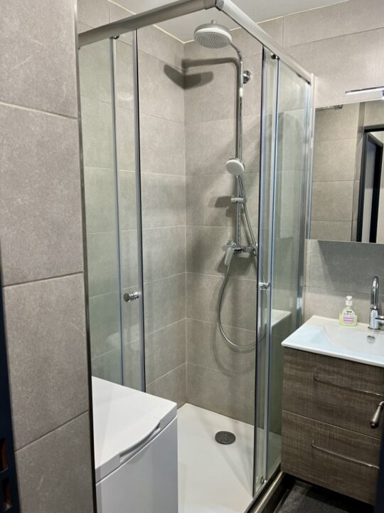 Bathroom: shower + towel radiator + washing machine + hairdryer + storage space